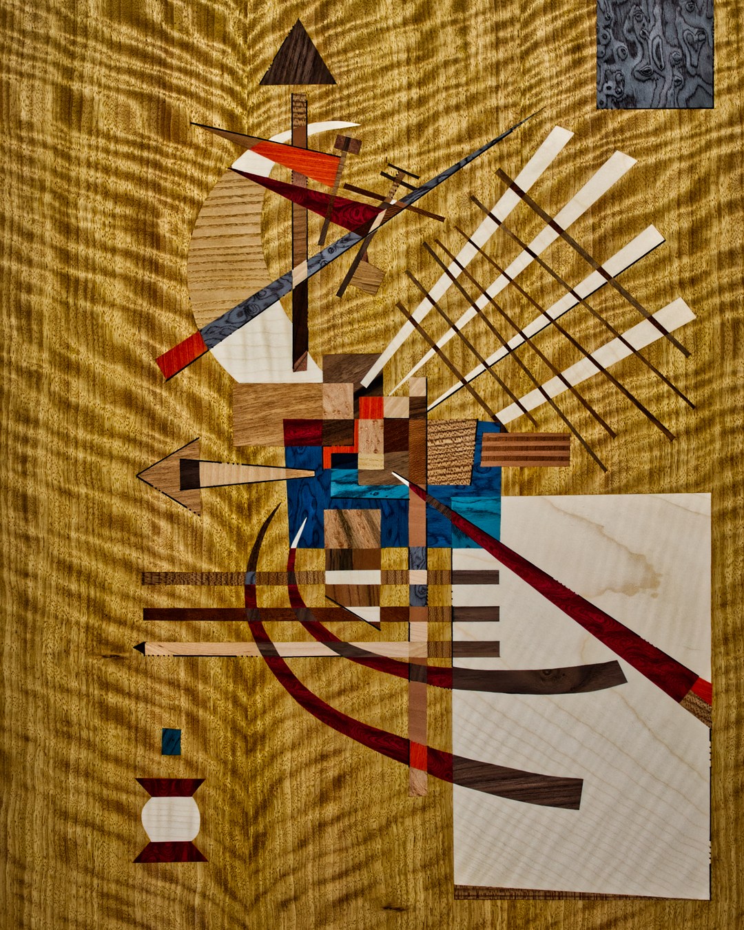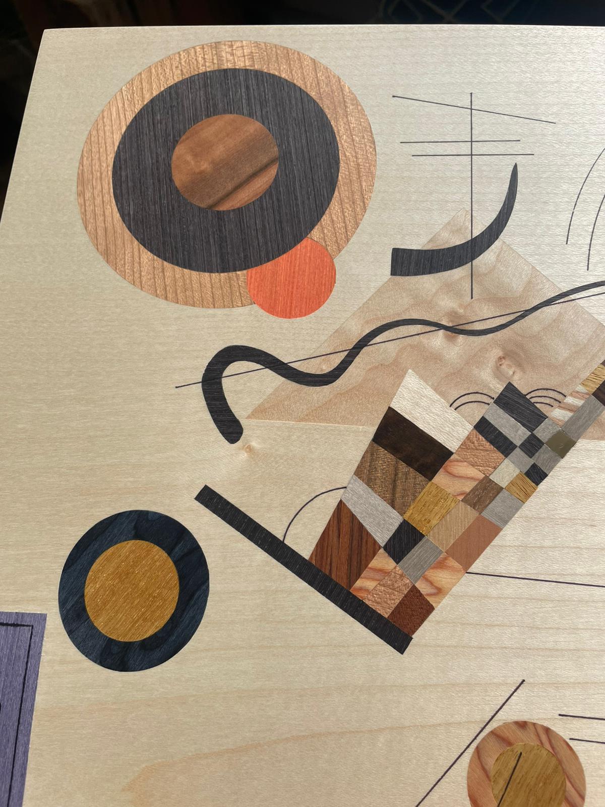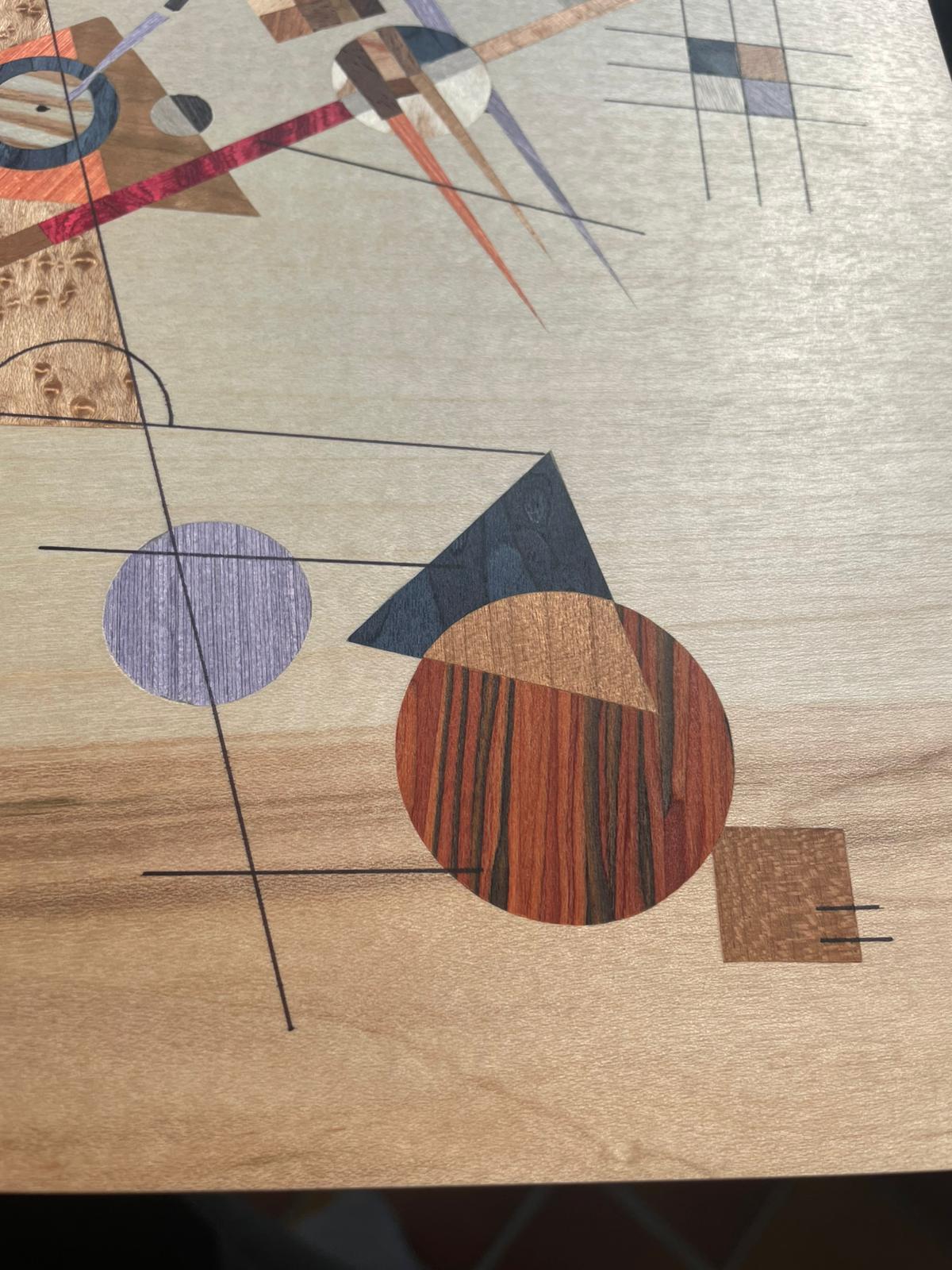 Diese Intarsie war mein bisher größtes Projekt, ein Bild aus vorwiegend hellen Holztönen wie Esche, Zitrone oder Pappel auf einem Sapeli-Grundfurnier.