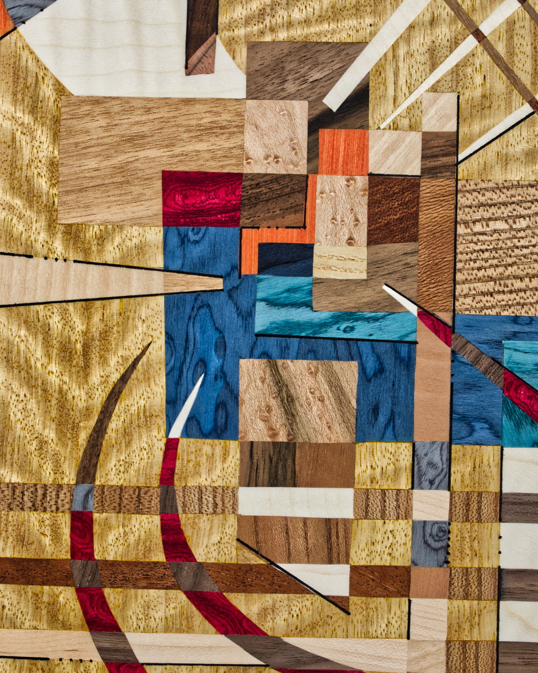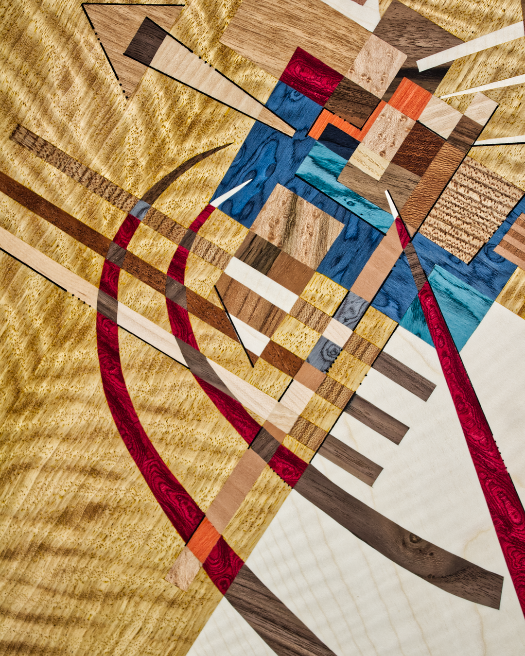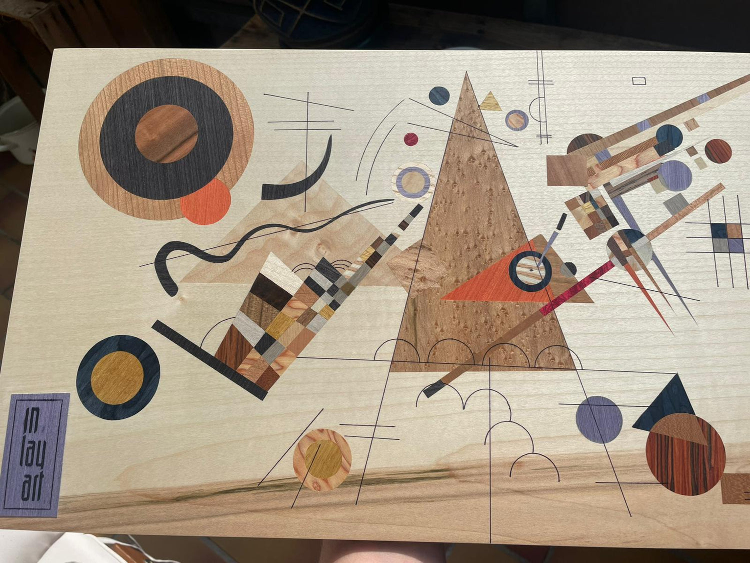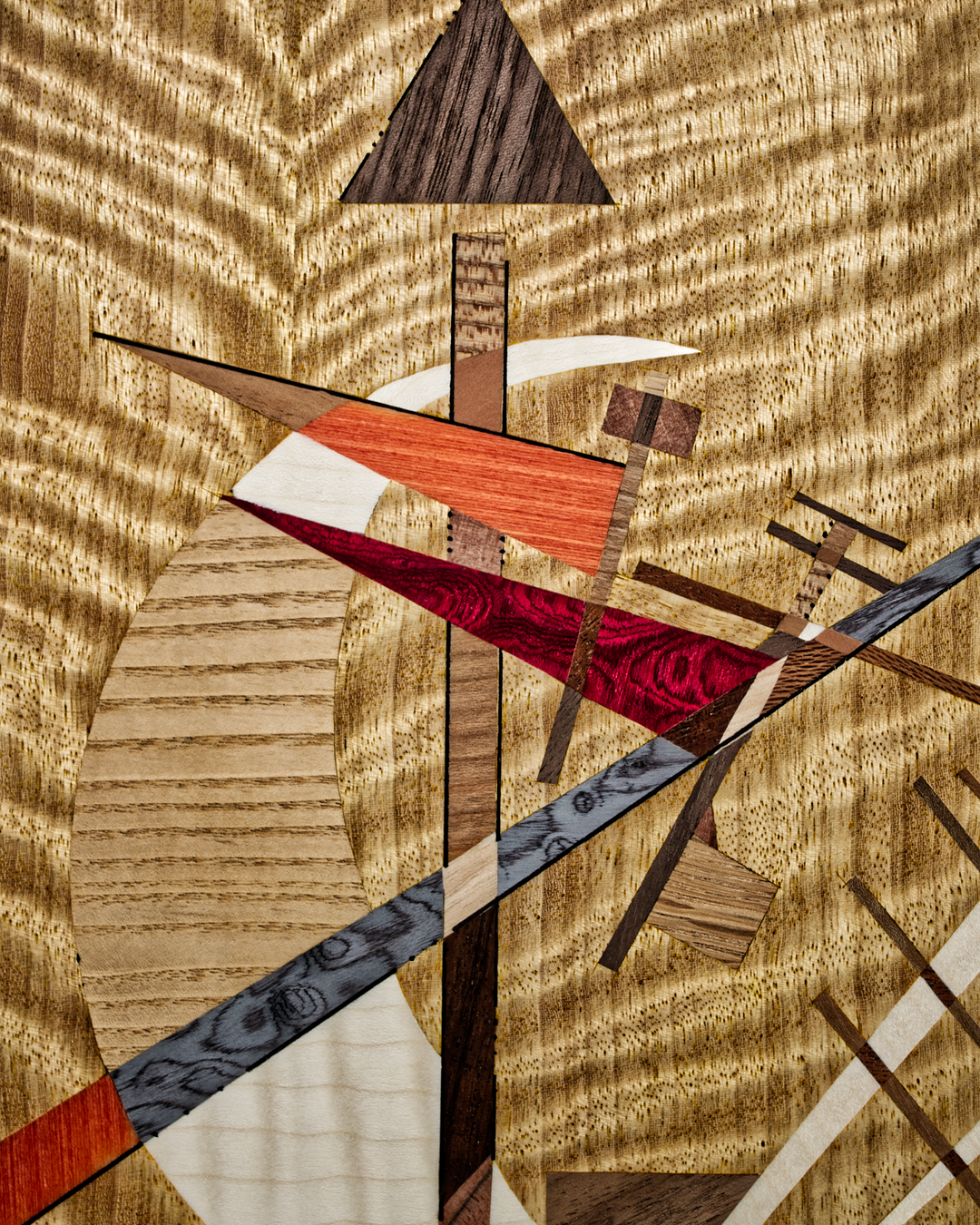 Diese Intarsie war mein bisher größtes Projekt, ein Bild aus vorwiegend hellen Holztönen wie Esche, Zitrone oder Pappel auf einem Sapeli-Grundfurnier.