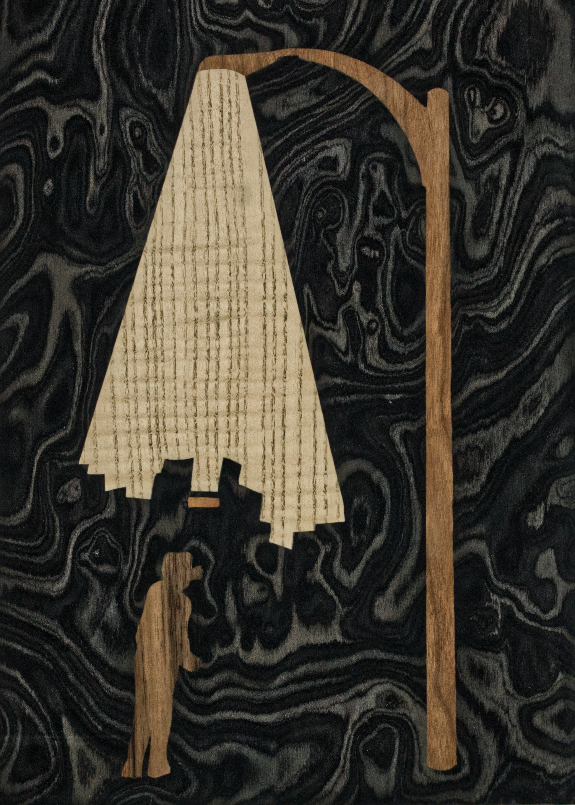 „Lichtmaler“ zeigt eine Person, die mit einer Malerrolle die Lichtstrahlen einer Laterne malt. Diese symbolische Darstellung von Kreativität und Licht wird kunstvoll in einer Intarsie aus Saraifo-Furnier eingefangen